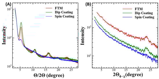(A) Out-of-plane XRD, and (B) in-plane GIXD profiles for the thin films fabricated with UFTM, dip coating, and spin coating.