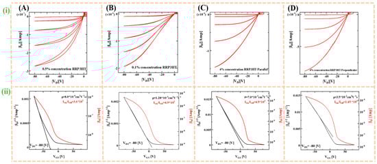 (i) Output and (ii) transfer characteristics of (A) spin-coated, (B) dip-coated, (C) UFTM-processed parallel, and (D) UFTM-processed perpendicular OFETs.