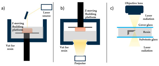 Vat photopolymerisation is a broad term; it refers to different technologies for fabricating finite objects starting from a liquid photocurable resin, which is photopolymerised layer by layer using a laser or a projector. These systems can ensure the highest resolution and accuracy level, a good interlayer bonding (adhesion between consequent slices), and smooth surface, upon choosing the correct set of printing parameters. It is also possible to print more pieces at the same time, depending on the built plate dimensions. The printing process is fast enough, even if, for complex geometries and for bigger parts, it can take hours [5]. The technologies that are referred to as vat photopolymerisation are stereolithography, digital light projection, and two-photon polymerisation. A schematic representation of how these technologies work is provided in Figure 1.