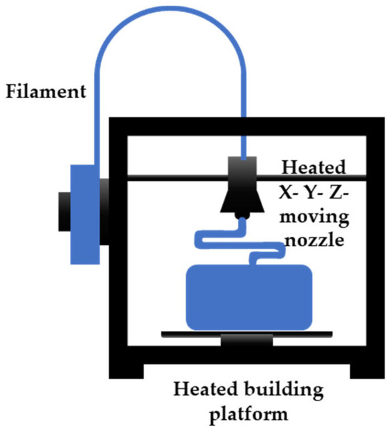 Fused filament fabrication (FFF) technology belongs to the extrusion-based AM technologies, because it involves the extrusion of a filament through a nozzle that heats the material above its melting point. The semi-molten filament comes from a spool, that continuously feeds the printing head and that can contain a thermoplastic or a metal material. The nozzle can move along three axes, to construct geometries layer by layer on the heated printing bed, ensuring the better adhesion of the printing objects. A schematic representation of the technology’s working principles is shown in Figure 2. Some FFF printers use a second heated head to simultaneously print a second material that can be used as sacrificial material, for supports, or as reinforcing material, for some applications [5,19]. On one hand, this printing technique has different advantages, like a low cost, the high performance of the printers, and the wide variety of materials that can be used, even transparent and biocompatible ones. Moreover, FFF printers are user friendly and environmentally friendly, and the chemical or UV post-curing of the printed parts is not a required step [5,20]. On the other hand, some disadvantages can be identified, such as a low resolution and low surface quality, due to the filament thickness, bad surface finishing, and a long printing time for complex objects [5].