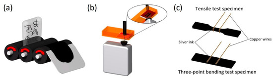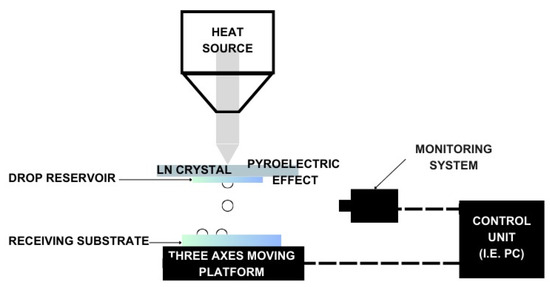 The inkjet printing (IJP) technique is a material-jetting process that is part of the non-contact direct-writing class of printing technologies. The inks, that are a solution or dispersion of nanoparticles into a solvent, are deposited on a flexible or rigid substrate by a nozzle, filled with material through the hydraulic system that connects the ink reservoir and the printing head. The printing head is itself a MEMS actuator, and it can be a thermal, a piezoelectrical, or an electrodynamical actuator. The deposition system can eject material with a continuous flow (called a continuous IJP) or drop by drop (called a drop-on-demand delivery system) along the Z axis, mainly. Both the printing techniques can process geometries with a resolution of 20 µm or higher, by adjusting the applied voltage, the printing bed speed, the chemical composition of the ink, and its viscosity and surface tension. The printing bed moves in the XY plane, following a vector-based path from a CAD drawing, and it can be heated, to promote solvent fast evaporation [16]. An evolution of inkjet printing technology is the Pyroelectric–Electrohydrodynamic (pyro-EHD) system, a nozzle-free inkjet technology that includes a heating system, three-axes moving platform, and a monitoring system. The ink reservoir is a microscope glass slide, placed under a Lithium Niobate (LN) crystal positioned on the platform. The platform motion control system has a high linear precision to ensure a maximum travel speed of 30 mm/s, and it deposits the ink on a printing bed, made of a cover glass, that can host the substrate. The material is ejected after the crystal heats up, because of the breaking of liquid surface tension by a strong field gradient that generates instability. This pyroelectric effect is a temperature-dependent effect, as shown by Equation (1):