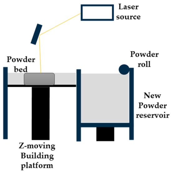 Powder bed fusion (PBF) processes are AM technologies where a thermal energy source selectively fuses a powder, which can be metallic or polymeric. A fixed amount of the powder is spread onto the building bed using a recoater, usually a roller, to obtain a smooth and homogeneous layer that guarantees the density and the homogeneity of the layer. After that, the thermal source is activated, and the fusion of the powder particles starts in the selected regions. Commonly, the energy source is a laser beam that is focused on different points of the area in the XY plane. Other possible energy sources are high-power electron beams or infrared light, which heats up regions where a heat-conducting liquid has been previously dispersed. Then, the consolidation of the single layer happens, because of the coalescence between particles due to the temperature increasing in the area. The heated part solidifies with the cooling down of the powder bed; lastly, the printing bed is lowered a one-layer thickness, to deposit a new layer of powder [16]. One of the widespread powder bed fusion techniques is selective laser sintering, for polymeric materials, and selective laser melting, for metals. The technology’s working principles and components are shown in Figure 4.