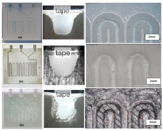 Fabricated micromixers by three different methods of printing. (a) Micromixer with PolyJet in cross-section and top view, (b) micromixer with SLA in cross-section and top view, (c) micromixer with FDM in cross-section and top view. Reprinted from [36].