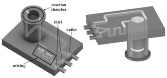The design chosen in the work of Zeraatkar et al. [36] presented two inlets for the two fluids that were connected to the serpentine, which was a square-like channel consisting of 18 turns, whose dimensions were 600 µm wide and 600 µm high, and, at the end, there was an outlet. The SL apparatus used was Formlabs Form 2, while the printed material was Clear Form V2 UV, to obtain a transparent object, whose channels were closed with a tape. The inner surface of the SL-printed device was smooth, the channel dimensions showed little differences from the nominal ones, and the device ensured a good mixing efficiency at different flow rates [36].