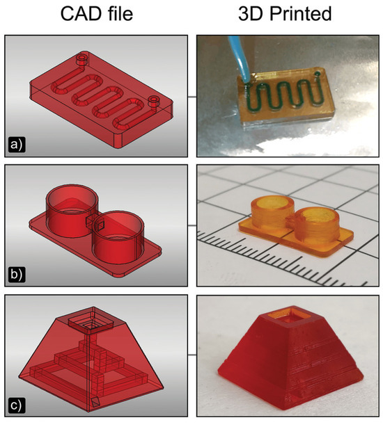 DLP-printed microfluidic objects compared to their CAD models. (a) 3D printed microfluidic chip with an s-shaped channel of 800 µm of diameter; (b) Two 3D printed wells connected by a 1 × 1 mm2 square section channel; (c) Trapezoidal 3D printed microfluidic chip with a 1 × 1 mm2 channel square section. Reprinted from Advanced Material Technology, vol. 5, no. 9, G. Gonzalez, A. Chiappone, K. Dietliker, C. F. Pirri, and I. Roppolo, “Fabrication and Functionalisation of 3D Printed Polydimethylsiloxane-Based Microfluidic Devices Obtained through Digital Light Processing”, September 2020, with permission from John Wiley and Sons [39].