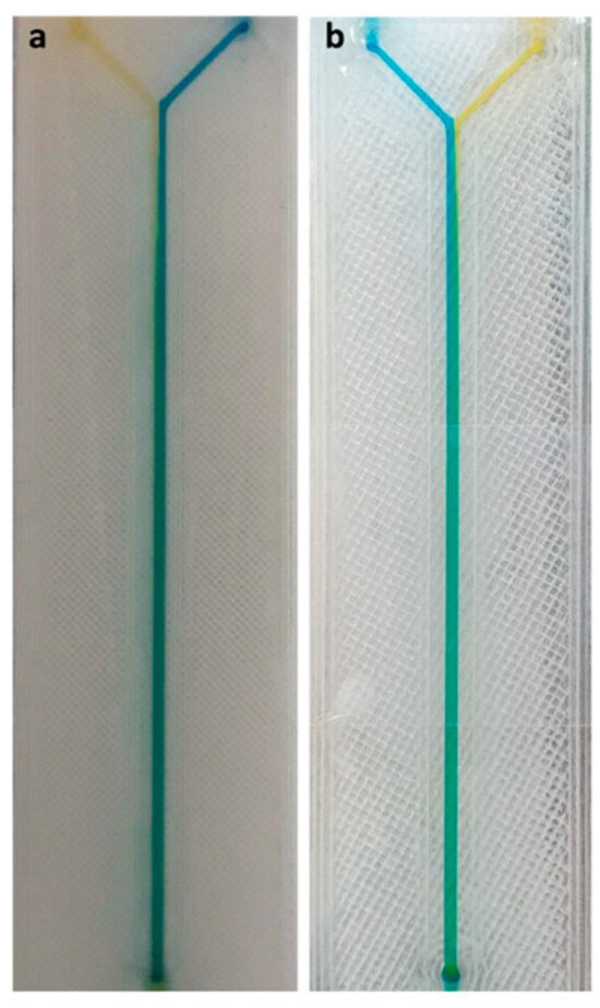 FFF-printed micromixers, whose channels were filled with different colourants, to verify the mixing power of the device. The (a) model was made in translucent PLA, the (b) model was made in transparent PLA. Reprinted from [20].