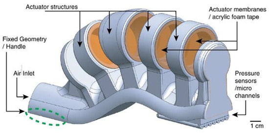 The first example here reported comes from the group of Spina et al. [2]; they explored the possibility of directly 3D printing a soft robotic actuator that integrated a pressure sensor, for tactile and gripping applications. Their inspiration came from living organisms that show a proprioceptive ability; so, they tried to replicate it in an artificial finger that generated force and provided feedback about pressure, through a series of microchannels where a liquid metal, eutectic gallium–indium (EGaIn), flowed with a certain resistance that varied with pressure. This device was conceived from the perspective of collaborative manufacturing for middle-sized parts. The printed object, whose CAD rendering is reported in Figure 10, was fabricated with Objet30 Prime®, from Stratasys, a PolyJet printer with a 28 µm resolution, using as a printing material the TangoBlack® FLX973 rubber-like acrylic and, as a support material, SUP706, both from Stratasys. The microchannels were seven in number, with a diameter of 350 µm each, and they were connected to the electronic readout for a real-time monitoring of the pressure value during the gripping phase. The actuator part was composed of a ring-shaped structure mounted over a hollow main body, pneumatically actuated, so the insertion of the air inside the main channel provoked the expansion of the wall, which meant the deflection and bending of the whole structure.