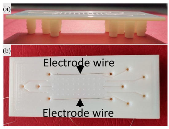 A further example of DLP’s application to microfluidic chips is the work of Bucciarelli et al. [40], which reported the optimisation process for device fabrication through 3D printing of a commercial transparent resin, GR-10 from pro3dure medical GmbH, that is also biocompatible, according to ISO-10993 [41]. This resin, made of bisphenol A-ethoxylate dimethacrylate (2 EO/Phenol) and BAPO, was 3D printed with an Asiga MAX X27 UV, from Asiga, whose characteristics are a printable volume of 51.8 mm × 29.2 mm × 75 mm, an XY resolution of 27 µm, and a high-power LED at 385 nm. The printed object had high-aspect ratio-critical features, namely, a series of squared pillars with 100 µm width and 1.2 mm height, inside the 2 mm-thick fluidic chamber. In order to compare the fluidic performances of traditional PDMS microfluidic chips obtained through replica moulding with the 3D-printed devices, they sealed the printed chip with a PDMS layer through oxygen plasma treatment, then they performed a fluidic test, inserting a mix of food dye and water using a syringe pump, for one week. The fabricated devices demonstrated that, by tuning the printing parameters, it was possible to achieve small features (down to 50 µm) with a high aspect ratio, up to 60, using DLP for the direct fabrication of microfluidic devices, while it was more difficult with replica moulding, because of the incomplete PDMS curing at the mould–PDMS interface, the material density and the detachment required force, due to surface roughness that should be smoothed with a post-treatment. Directly 3D-printed chips also showed a higher resolution, no leakage, high transparency, and a higher Young’s modulus and yield stress, even if the printed parts should be sealed with an additional step, and they also showed an excess in the XY dimension (around 28%) in respect to the nominal CAD dimension, probably linked to the higher exposure time required for high-aspect ratio structure fabrication. However, the intermediate step of channel sealing allowed the achievement of a deep cleaning of the piece, and the possibility to combine other fabrication technologies such as bioprinting or to insert elements like electrodes and sensors before the sealing [40].