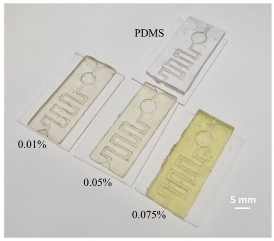 Herein is reported, as a first example of DLP application to MEMS devices, in particular for microfluidic platform fabrication, the work of Gonzalez et al. [39]. In this study, they prepared a PDMS-like resin for microfluidic devices, and they used as a fabrication technique DLP 3D printing. Their resin contained an acrylate polydimethylsiloxane copolymer as the oligomer, TEGORad2800 (Evonik, Essen, Germany), a blend of phenyl bis(2,4,6-trimethylbenzoyl) phosphine oxide (BAPO), composed by a BAPO-methyl ester, a BAPO-isooctyl ester, and isooctanol as the photo-initiator, dispersed red 1 methacrylate (DR1-MA) as a visible-light absorber dye, and methyl methacrylate (MMA) monomer for solvating the dye. The microfluidic chip was fabricated using an Asiga PICO 2 DLP-3D printer (Asiga, Alexandria, Australia), which presents a LED light source at 405 nm, an XY resolution of 50 µm, and a Z resolution of 1 µm. The selected printing parameters were a layer thickness of 50 µm, light intensity of 20 mWcm−2, and exposure time of 10 s per layer. Different complex microfluidic platforms were printed, as reported in Figure 7, and the unreacted double bonds were used for attaching functional molecules on the channel surface, to enhance the surface properties compared to classical PDMS devices obtained through soft lithography. The printed samples showed high chemical stability, good mechanical properties, flexibility, stretchability, and high optical transparency, and their surface properties were proven to be easily and selectively modifiable; all these considerations demonstrated the compatibility of this fabrication process with the requirements for microfluidic platforms for several applications.