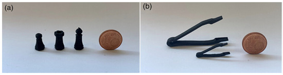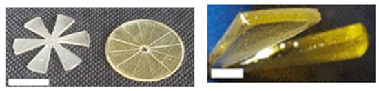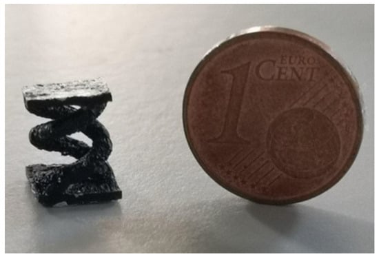 Many of the 3D-printed MEMS have been fabricated through SL technology, which is one of the most accurate and high-resolution techniques. One interesting application has been reported by Scaccabarozzi et al. [29]; they fabricated a holder for a quartz crystal microbalance for space applications. Their work relied on the SL printer FormLabs 3D printer, with a printing resolution of 0.05 mm, and on FormLabs resin (FLHTAM02), which ensures the right mechanical and thermal characteristics, to obtain a compact and lightweight solution. Their holder design was determined using a finite-element (FE) approach, referring to some requirements for the same devices for space applications. It presented two disks that had to be assembled to handle the crystal but ensuring the insertion of electrodes at the same time; there were also holes for screws, to preload the crystal. Comparison of FE simulations with the device’s mechanical characterisations underlined the agreement between the experimental behaviour and expectations, even if further experiments in a space-like environment were required to validate the applicability of the device as a space microbalance.