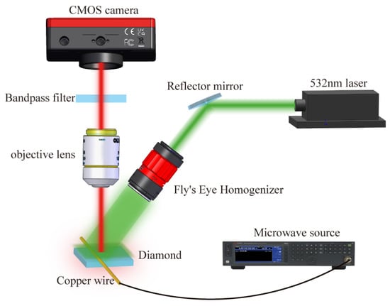 Upon excitation by the 532 nm laser, the NV center emits red fluorescence, collected through the objective lens and filtered before being received by the CMOS camera (LP126 MU). In the microwave system, a fixed microwave antenna beneath the diamond generates the microwave field, with its frequency and power controlled to form various microwave fields [