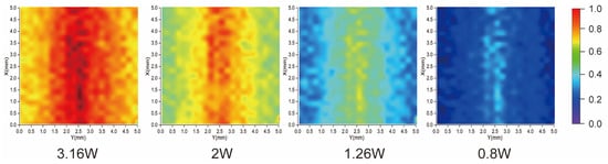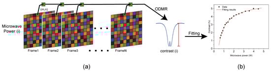 Figure 4a. Initially, the data from each pixel of the camera-captured image are extracted; then, these image pixels are averaged. This means that a complete fluorescence image is segmented into multiple units, with the pixel data within each unit combined to form the unit’s data value. Following this, the data from the same position unit in each frame can be sequentially retrieved, both before and after the image acquisition time. This allows for individual calculation and generation of the optically detected magnetic resonance (ODMR) spectrum for each unit. Subsequently, the microwave intensity of each unit is computed separately, thereby enabling the derivation of the microwave field distribution across the entire position of the diamond NV color center probe. The number of pixels within a unit defines the imaging resolution, and thus, we characterize the resolution by the number of pixels M contained in each unit. As M increases, the resolution decreases. However, each unit will encompass more NV color centers, capable of capturing stronger fluorescence signals. This results in an effective enhancement of the signal-to-noise ratio and overall system stability. Hence, M serves as a representation of the performance of the entire imaging system. Following the experiments and considering both imaging speed and quality, the system’s M value is set to 50. Notably, the minimum limit for M is 1. Additionally, as M decreases and the amount of sensing increases, the initialization time and corresponding operational duration of the entire imaging system will increase several times.