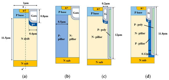 Silicon carbide (SiC), with the advantages of wide-band-gap semiconductors, is widely used in power MOSFET devices to obtain lower on-state resistance (Ron), higher breakdown voltage (BV), and better frequency characteristics [1,2,3,4]. With the development of SiC MOSFETs and industry applications, requirements have been raised for SiC MOSFETs, and corresponding new structures have been proposed. Super-junctions are a good candidate device structure and have been introduced into SiC-based MOSFET devices [5,6,7,8]. In the charge balance theory of super-junction structures, this structure can break the material limit of the tradeoff between the breakdown voltage and the specific on-resistance (Ron,sp) and achieve a lower Ron,sp while keeping the BV in reasonable ranges [9,10,11].