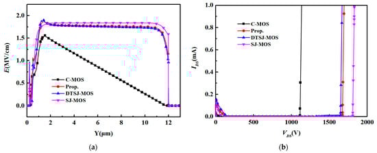 (a) Electric field distributions in the vertical direction. (b) The off-state characteristics.