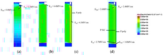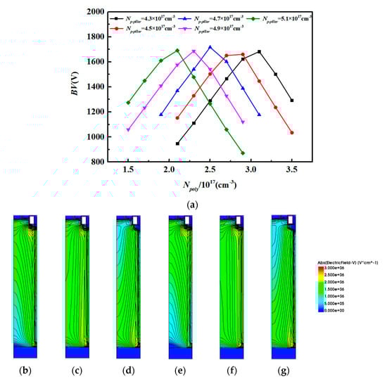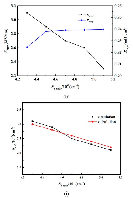 Figure 4b–d show electric field distributions when the Npoly changes from 2.5 × 1017 cm−3 to 3.5 × 1017 cm−3 while keeping the concentration of NP-pillar at 4.3 × 1017 cm−3. Figure 4e–g shows the electric field distributions when the Npoly changes from 2.1 × 1017 cm−3 to 3.1 × 1017 cm−3 while keeping the concentration of NP-pillar at 4.7 × 1017 cm−3. The figures show that the effect of charge balance in the new structure is similar to the conventional super-junction MOSFET. The peak electric field occurs at the bottom of the deep trench, which is mainly affected by the distribution of p-type doping. Figure 4h shows the relationship between the EMOX, Ron, sp, and NP-pillar. With the increasing NP-pillar, the field protection for the deep trench becomes stronger, and hence, the EMOX decreases. When the NP-pillar is lower than 4.7 × 1017 cm−3 (which means that the Npoly is higher than 2.5 × 1017 cm−3), the EMOX will be over 2.7 MV/cm and becomes unacceptable. However, the Ron,sp rises slowly with the NP-pillar, which indicates that the NP-pillar has little effect on Ron,sp. Also, to make full use of P-poly and increase the manufacturing window of the P-pillar, the Npoly should be as high as possible. As a result, we selected the values of Npoly and NP-pillar to be 2.5 × 1017 cm−3 and 4.7 × 1017 cm−3, respectively.