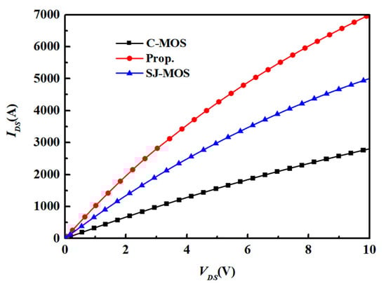 Figure 5 shows the first quadrant I–V characteristics of the three structures. The gate voltage (Vgs) is 15 V. The Ron,sp for the new device is 0.93 mΩ·cm2, which is about 67.93% lower than the 2.9 mΩ·cm2 of the C-MOS and 35.41% lower than the 1.44 mΩ·cm2 of the SJ-MOS. The doping concentration of the N-pillar for the SJ-MOS and new structure is 9.5 × 1016 cm−3 compared with 7.5 × 1015 cm−3 for the C-MOS. A lower concentration greatly increases the total electron current in the drift region and results in a significant reduction in Ron,sp. At the same time, the new structure uses thin P-poly-silicon within a deep trench to replace the conventional P-SiC pillar in the SJ-MOS; the current path is further enlarged, which leads to a much lower Ron,sp.