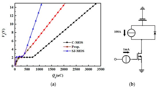(a) Gate charge characteristics for the C-MOS, SJ-MOS, and new structure. (b) Test circuit.