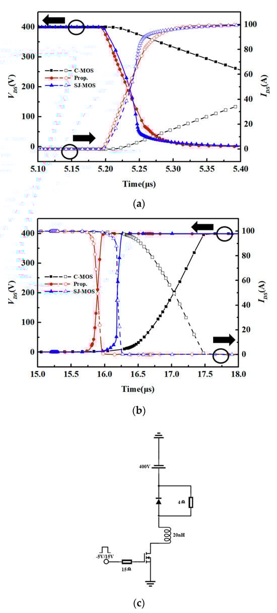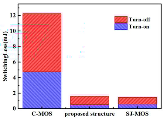 The switching characteristics of the structures are shown in Figure 7. The simulation was applied with a typical testing circuit with an inductive load, as shown in Figure 7c. As can be seen, the turn-on and turn-off times of the new device are significantly shorter than the ones for the C-MOS and close to the values for the SJ-MOS due to the low Qgd. Because of the high switching speed, the dIds/dt of the new structure is higher than the other structures. The switching loss of the different structures is shown in Figure 8. The turn-on and turn-off losses of the new device are 0.51 mJ and 1.09 mJ, respectively. In comparison, the turn-on and turn-off losses for the C-MOS are 4.76 mJ and 7.48 mJ. For the SJ-MOS, the values are 0.58 mJ and 0.88 mJ. As a result, the total switching loss of the new device is fair to the SJ-MOS and about 79.45% less than the one for the C-MOS. It is thus demonstrated that the new device has a superior switching character.