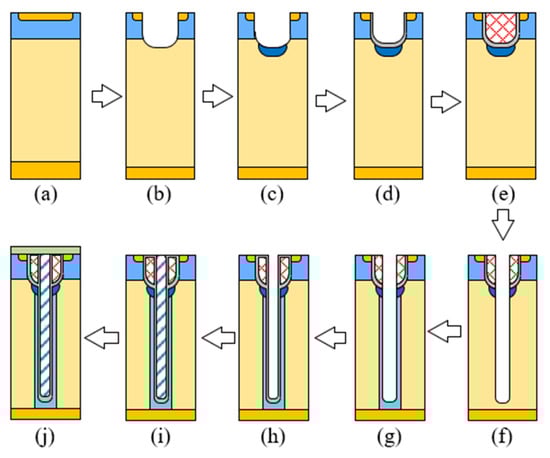 Regarding the feasibility of the new structure, a fabrication process is proposed in Figure 10. Compared with the SJ-MOS, the fabrication of the new structure is much easier to process because there is no need for a large p-SiC area. First, the N drift region is formed by epitaxial growth on a N+ substrate. Then, the P well and the N source area are made through ion implantation. Then, a shallow trench is fabricated by ICP (Inductively Coupled Plasma) etching, and the P+ protect area is formed by vertical implantation. After that, thermal oxidation is performed on the shallow trench. By filling it with n-type poly-silicon, a gate trench is formed. Then, we etch again to form a deep trench and implant to form a deep P-pillar. Thermal oxidation forms a deep trench oxide layer. Finally, the deep trench is filled with P-poly and connected to the source electrode through the metal layer, and the device is formed.