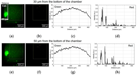Figure 8 shows the result of using device I. The spatial distribution of the fluorescence intensity in the yellow rectangle shown in Figure 8a,b was measured. The origin of the vertical coordinate is at the top of the yellow rectangle: the larger the coordinate value, the closer it is to the alginate gel fiber. Figure 8a,b show green and red fluorescent images processed by ImageJ (NIH). Figure 8c,d depict the graphs of their intensities along the vertical direction, thus showing the difference in luminescence corresponding to the position of the alginate gel fiber. The approximate height from the bottom of the chamber was 50 µm. The cell aggregate was also observed at 70, 90, and 130 µm from the bottom of the chamber. Similarly, Figure 8e–h, Figure 8i–l, and Figure 8m–p show the results at 70, 90, and 130 µm, respectively.