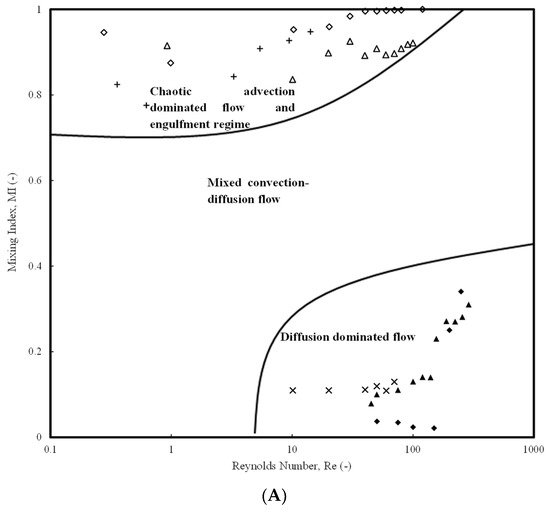 This section focuses on the analysis of pressure drop and MI data to find the following: (1) A comparison of the designs of micromixers of different categories was made based on the measured pressure drop to one obtained if the micromixer were a microchannel; (2) a determination of the operating region for efficient operation of micromixers based on optimum MI and pressure drop was conducted; (3) a classification of MIs based on different regimes, namely diffusion, convection, and chaotic motion, was made. First, the percentage increase in the pressure drop in magnitude in a micromixer, as compared with that in a microchannel, and the corresponding increase in MI needs to be understood. Table 6 shows a comparison of the pressure drops in micromixers for different categories. The comparison is made as follows: The reported data of pressure drop (either predicted by numerical simulations or measured using experimental measurements) of the selected micromixers are collated. The Hagen–Poiseuille equation is applied to calculate the pressure drop if the micromixer were a microchannel for laminar flow through the microchannel. The microchannel was assumed to have a hydraulic diameter without mixing elements. The % increase in pressure drop due to micromixing elements for each of the reported data is shown in Table 6. Most of the data shown in the Table 6 are at Re (Re = 50 or near to 50) so that a good comparison between all the categories can be obtained. Two different Re values, namely Re = 40 and Re = 100, have been also been shown to report a wider range of Re and the unavailability of data by the authors. However, the objective is to compare different category micromixers for the same Re. Clearly, the pressure drop increases with an increasing degree of complexity with Category 1 having the lowest percentage increase and other categories having higher increases in pressure drop, except two micromixer designs by Niu et al., 2022 [32], which have a pressure drop higher than 1000% or an order of magnitude higher than if the micromixer was a straight channel. Though, such designs might provide an excellent mixing index, such designs should be avoided since they increase both the energy consumption and the cost. From the chosen micromixers, the micromixer of Mahmud et al., 2021, (Category 2) and Yuan et al. [87] (Category 4) prove to be very efficient micromixers that have a lower pressure drop and a high mixing index. This also suggests that through adding obstructions, Category 3 increases the mixing characteristics in the system but also increases the pressure drops drastically. Category 1 micromixers have a low pressure drop so the mixing index is very low. Hence, flow optimizations need to be performed to obtain a higher mixing index but a lower pressure drop, which, from the selected micromixers, seems to be in one of the Category 4 passive micromixers.