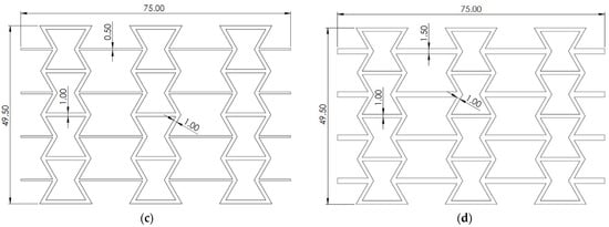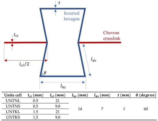 Re-entrant Honeycombs (RHs) with modified unit cells are considered in this study. The modification involved changing the geometrical parameters of chevron crosslinks, i.e., thickness () and length (), resulting in four design architectures including re-entrant unit cells with thin–long (TNL), thin–short (TNS), thick–long (TKL), and thick–short (TKS) chevron crosslinks. The geometry of the basic inverted hexagonal shape was maintained in the different structures. This geometry has four parameters, including the length of the horizontal strut (), the length of the diagonal strut (), the angle of the diagonal strut (), and the thickness of the strut (t). The selected dimensions for , , , and t are 14 mm, 7 mm, 60°, and 1 mm, respectively. The unit cells with the different types of crosslinks were named UNTNL, UNTNS, UNTKL, and UNTKS. Figure 1 summarizes the geometrical parameters of the re-entrant unit cells.