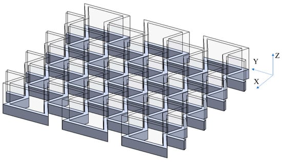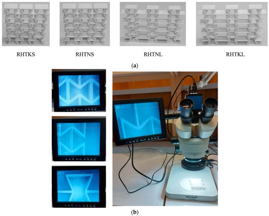 In this work, the re-entrant honeycombs with modified unit cells were made of PLA and manufactured using FDM. Three-dimensional CAD designs of honeycombs were prepared and exported to the STL format. The STL files were then imported into the 3D printer software to convert the model into G-code files. A commercial machine (Ender 3 V2) was used for the FDM process. This 3D printer has a print precision of ±0.1 mm, a layer thickness in the range of 0.1–0.4 mm, a typical printing speed in the range of 50–60 mm/s, and a bed temperature of . The 3D printing process parameters were an extruder temperature of 220 °C, a bed temperature of 60 °C, a layer thickness of 0.2 mm, and an infill density of 100%. The zigzag infill pattern with a bidirectional raster angle was selected where the raster angles, i.e., the direction of infill lines, of successive layers were ±45°. These parameters were commonly used in similar studies [26]. The samples were built in the Z-direction, as shown in Figure 3. This building orientation was selected to avoid the need for support structures. To verify the quality of the printing process, the printed structures, shown in Figure 4a, were inspected closely using precision measuring tools and a microscope (Figure 4b). A digital calliper and micrometre were used to measure the overall dimensions, i.e., length, height, and width, at multiple locations of the printed samples. The thickness of the struts was estimated using the microscopic images. FDM-printed samples showed a high dimensional accuracy, where their dimensions were highly comparable to the design values, i.e., CAD models. Also, the visual and microscopic inspections confirmed that the fabricated structures have smooth surfaces and are free from common FDM process defects such as warping, curling, or cracking (delamination).