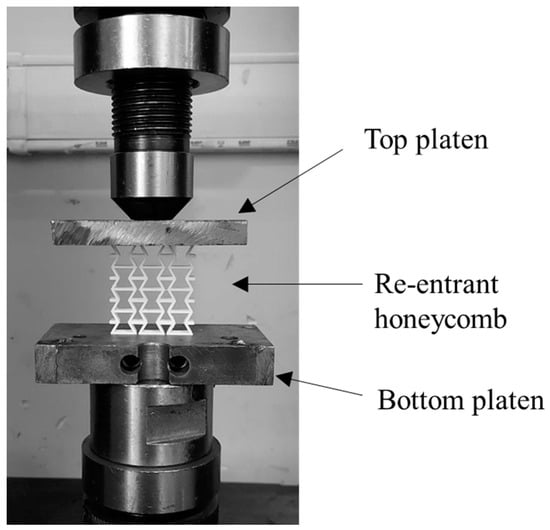 The mechanical performance of re-entrant honeycombs can be assessed by conducting compression tests. In this work, the compression tests were implemented using a Universal Testing Machine (UTM) fitted with a 150 kN load cell, as illustrated in Figure 5. The tested specimens were placed on the machine platen and aligned in a way that their top and bottom surfaces were parallel to and fully covered by the compression platens to ensure they were subjected to uniformly distributed loads during the test. The velocity of the moving platen was set to 10 mm/min to ensure a quasi-static loading scenario without triggering any dynamic effects. This velocity value is consistent with those reported in previous research studies on quasi-static compression loading [54,55]. Force and displacement datasets were recorded during the test and were then processed to produce the different mechanical responses of the tested structures.