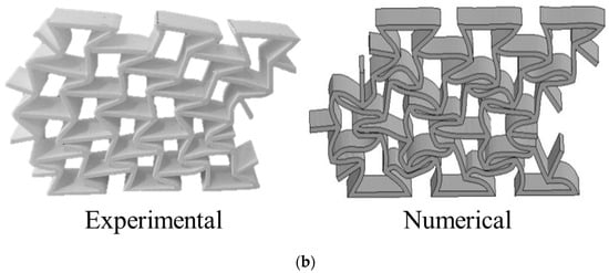 The model predictions were compared against experimental results to check the ability of the model to capture the required responses. A standard RH design, with and , was used to validate the numerical model. Figure 8 presents the numerical and experimental stress–strain responses and the deformation modes of the structure. It is clear from the stress–strain curves that the numerical model can reasonably predict the elastic and post-collapse responses of the structure. Similarly, the model was able to capture well the deformation pattern of the honeycomb. In the remainder of the paper, the FE model was mainly used to discuss the deformation modes and to estimate Poisson’s ratio in the elastic phase; therefore, its accuracy, as discussed earlier, was deemed enough for the scope of its use in the current study.