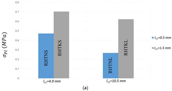 The influence of the crosslink’s geometrical dimensions on Young’s modulus is depicted in Figure 12a. The honeycombs with thicker and shorter crosslinks have a higher stiffness (less elastic deformation) than the honeycombs with thinner and longer crosslinks. The influence of on E is greater than the influence of . The maximum change in E with is 68.25%, while the maximum change in E with is 17.16%.
