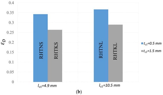 Figure 12c displays the PRs of all RHs. RH designs with shorter crosslinks have a greater auxetic performance than those structures with longer links. These results agree well with the observed deformation patterns presented in Figure 11. This behaviour can be elucidated by the effect of the high stiffness of the shorter crosslinks. The stiff crosslinks, in RH with shorter crosslinks, induce greater bending moments in the inclined struts of the re-entrant cell, leading to a higher deflection/rotation of these struts and a greater dimensional change in the lateral direction. RHTKS and RHTNS demonstrate comparable PRs of −2.86 and −2.68, respectively. RHTKL exhibits the lowest PR of −0.55, corresponding to an average lateral displacement of −1.5 mm.