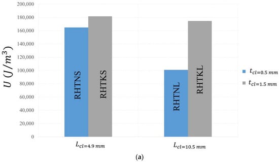 The changes of toughness with the thickness and length of crosslinks are displayed in Figure 14a. U increases with increasing thickness and decreasing length. The RHTKS honeycomb with and absorbed 181,644.65 J/m3, which is 80% greater than that of the RHTNL honeycomb with and . U is more sensitive to when is bigger. Changing from the upper limit to the lower limit reduced U by 9% and 73% in the honeycombs with short and long crosslinks, respectively. Conversely, U is more sensitive to the in honeycombs with thinner crosslinks. U increased by 63.3% and 4% when decreasing in honeycombs with thin and thick crosslinks, respectively.
