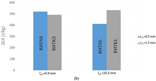The influence of crosslink dimensions on SEA is presented in Figure 14b. It appears that SEA has no consistent trend with the parameters of crosslinks. SEA increases with increasing in the structures with thick crosslinks, while it decreases in the structures with thin crosslinks. Similarly, SEA decreases with in the structures with short crosslinks, while it increases in the structures with long crosslinks. This behaviour might be because any change in the size of the crosslink yields a change in the mass of the structure and this balances out any changes in the energy absorption capacity. The RHTKL honeycomb, with and , outperforms all other honeycombs, showing the highest specific energy absorption capacity of 532.59 J/kg.