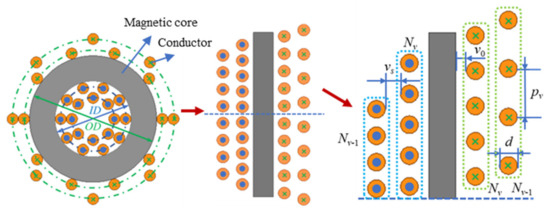 When using Ferreira’s method to calculate the loop magnetic field, the interlayer magnetic field may be overestimated. Therefore, we took into account the porosity parameter of the winding layers and corrected Ferreira’s method [34,41]. The modified Ferreira’s method is employed to calculate the AC losses of the solid round wire winding of the conventional structure (non-toroidal structure) [42]:
