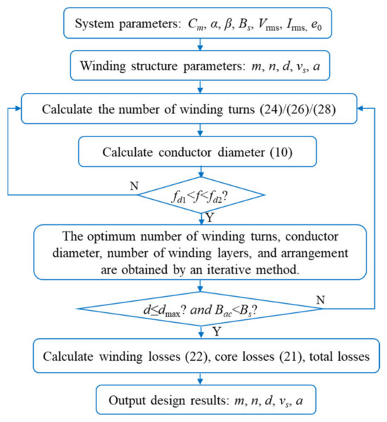 The objective of the optimization design model is to determine the winding structure of the magnetic device in order to minimize total losses. The core parameters Cm, α, and β are determined by the parameter manual of the selected core. Following general optimal design rules, the design variables of the magnetic device are determined: excitation parameters (f, Kv, Vrms, Irms), winding geometrical parameters (m, vs, d, n, α), and error margin parameter e0. Where m, n, a, and d are discrete variables to be optimized preferentially. The objective function is the total loss of the magnetic device. The constraints include ensuring that Bac is less than the saturation magnetic induction and that the winding cross-sectional area is less than the maximum allowable window area. Based on the aforementioned design basis properties, an optimized design flow for the winding structure of the magnetic device is proposed, as shown in Figure 3.