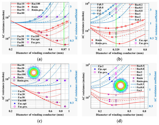 When fLF < f < fHF, the winding is not filled (Fac changes, porosity changes) with core, the analytical equation of Rac versus d can be obtained from (7) and (9), and the minimum value of AC resistance is defined as min (d, Rac), then the conductor diameter corresponding to the minimum value of AC resistance is the optimal conductor diameter doptMF; when f > fHF, the winding is not filled (Fac changes, porosity changes) with core, and the optimal diameter of the winding optimized design is doptHF.