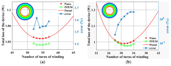 Figure 6 depicts the design of the optimal number of turns for different frequencies. The total loss of the device designed by the approximation method proposed in this paper is defined as Pana. PFEM denotes the total loss simulated by FEM. Ptotal is the total loss of the device estimated by the analytical method and determined by (21) and (22). error denotes the error between the total loss predicted by the approximation method and FEM.
