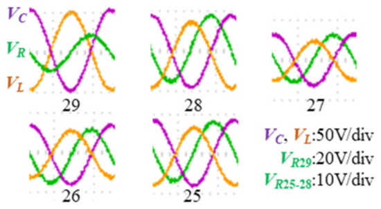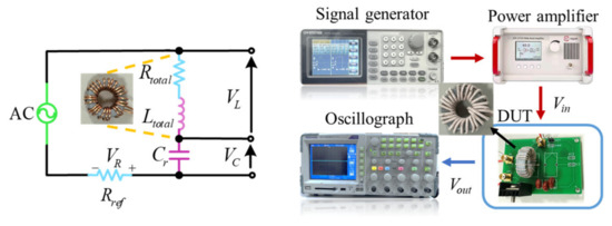 The compensated capacitance values and inductance values of magnetic devices are obtained with the impedance tester WK 6500B. The sinusoidal excitation is provided by a signal generator and a power amplifier. The RMS value of the input voltage is 8 V and the RMS value of the loop current is 0.8 A. As shown in Figure 8, the voltages of the inductance, capacitance, and resistance are measured by the oscilloscope.