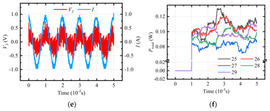 Measurements of virtual voltage, current, and total loss of magnetic devices. (a) V3 and I for 25-turn inductor, (b) V3 and I for 26-turn inductor, (c) V3 and I for 27-turn inductor, (d) V3 and I for 28-turn inductor, (e) V3 and I for 29-turn inductor, (f) the total loss of all measured devices.