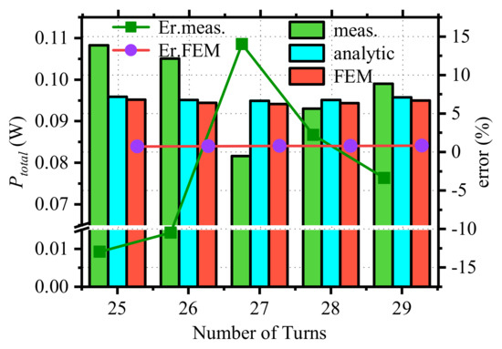 As shown in Figure 10, the optimum number of turns obtained by the three methods is 27 turns, and the total loss of the device is minimal. The maximum error between the FEM and the analytical method is 0.82%, and the maximum error between the analytical method and the experimental measurements is 13.99%.