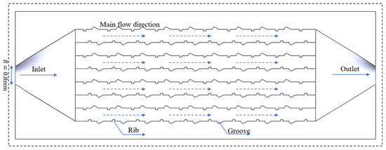At this point, a lot of papers have looked at the basic flow and heat transfer properties of single-phase convection in microchannel radiators. Among them, methods to enhance the heat dissipation performance of microchannels include nanofluids [2,3], inlet cross-section design [4,5], ribs and groove structures [6,7], porous media [8,9], wavy microchannels [10,11], etc. Adding ribs and groove structures to microchannels through flow destruction technology is an effective approach. K. Derakhshanpur et al. conducted numerical research on microchannels with semicircular ribs and found that an increase in the curvature of the semicircular ribs resulted in a significant increase in heat transfer coefficient and a slight increase in pressure drop [12]. Ergin Bayrak et al. used numerical simulation methods to study the heat dissipation of microchannels with different geometric shapes, discovering that microchannels with holes can mix the fluid at the center of the channel with the fluid near the wall, thereby improving heat transfer performance [13]. Datta et al. conducted a study on composite channels with ribbed grooves on the side walls. By comparing the Nusselt number, friction coefficient, and thermal performance changes, it was found that the composite channel had the best comprehensive performance [14]. Peitao et al. investigated the effects of rib height and cavity depth on the heat transfer performance of triangular ribbed microchannels. The optimal size of microchannels reduces the temperature difference at the bottom of the channel from 26 K to 17 K, resulting in an overall performance improvement of 1.2305 times [15].