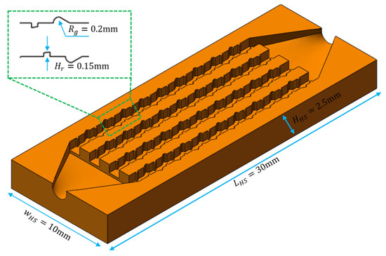 The TFMCHS was created based on the conventional RMCHS. The design parameters of the TFMCHS are presented in Figure 2. The geometric structure of ribs and grooves is mainly designed with the goal of reducing the boundary layer. Among them, for the rib structure, the upper and lower edges of the right-angle trapezoid are 0.11 mm and 0.15 mm, respectively, and the height of the trapezoid is 0.15 mm. The depth of the fan-shaped groove is 0.2 mm, and the included angle is 30°. The spacing between the ribs and grooves is 0.8 mm, with a period of 2 mm. The rest of the dimensions of the TFMCHS are the same as those of the RMCHS. Figure 3 shows the isometric view of the TFMCHS test piece.
