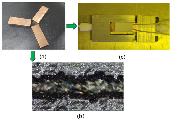Commercial laser-selective melting equipment (Dimetal-300, Leijia Additive Manufacturing Company, Guangdong, China) was used to print the designed microchannel heat sink samples. The printing parameters were set as follows: laser power at 350 W, scanning speed at 420 mm/s, scanning spacing of 0.06 mm, and layer thickness of 30 μm. To enhance printing precision and ensure structural integrity inside the microchannel heat sink, a 67° rotated printing method was chosen. After printing, a wire-cutting machine was used to remove the external support structures of the microchannel heat sink, as shown in Figure 4a. It can be observed that the external shape of the printed microchannel heat sink sample was well formed.