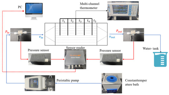 During the experiment, packaging testing was carried out first. Then, the inlet flow rate was set through a peristaltic pump, the inlet water temperature was set through a constant-temperature water tank, and the required heating plate power was also set. After a stable water supply for half an hour, the experimental data were recorded.