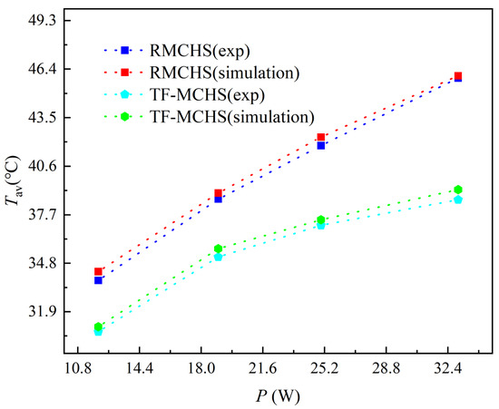 In order to verify the accuracy of the numerical solution, experimental data and simulation data of the microchannel were compared. Firstly, a multichannel thermometer was used to set five uniform temperature measurement points on the bottom of the microchannel to measure the average temperature of the bottom surface. The comparison between the experimentally measured temperature and the simulated temperature for MCHSs and TFMCHSs at is shown in Figure 6. It can be seen that under different heating plate powers, the experimental results and simulation results are in good agreement, and the deviation of the average temperature of the radiator bottom surface is less than ±3.7%. The average temperature calculated by simulation is greater than the average temperature tested by experiments. This is because the simulation calculation only considers the convective heat transfer between fluid and solid, ignoring the roughness effect of 3D-printed microchannels [32]. Therefore, the simulation and experiments in this article can ensure the accuracy of the data.