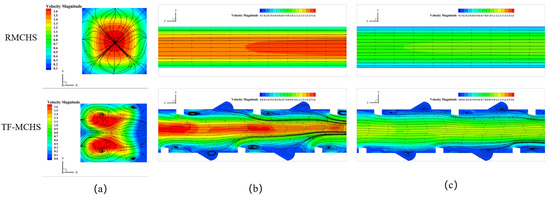 The geometric structure of microchannels has a significant impact on fluid flow. Figure 7 shows the flow velocity magnitude and streamline distribution of two microchannels at different flow velocities when . Figure 7a shows the velocity distribution cloud map of the cross-section at the entrance of the microchannel. It can be seen that the velocity at the center of the channel is the highest. This is because the closer the fluid is to the wall, the greater the viscous force it experiences. The TFMCHS generates four vortices at the inlet cross-section, mainly due to the presence of ribs and grooves interfering with the radial flow of the fluid, resulting in a pressure difference and the formation of vortices [10].