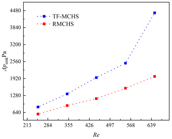 Figure 8 shows the variation of pressure drop with flow rate for two types of radiators when . It can be seen that the pressure drop of the two types of radiators increases with the increase in flow rate, and the pressure drop of the TFMCHS is greater than that of the RMCHS. This is because the pressure drop in a straight channel is mainly caused by friction loss on the inner wall of the channel, and the static pressure gradually decreases along the flow direction. For complex channels, a pressure drop not only includes friction loss along the inner wall of the channel but also includes pressure loss caused by direct fluid impact on ribs and grooves [35]. As the flow rate increases, the impact effect becomes stronger, and the pressure drop loss increases.