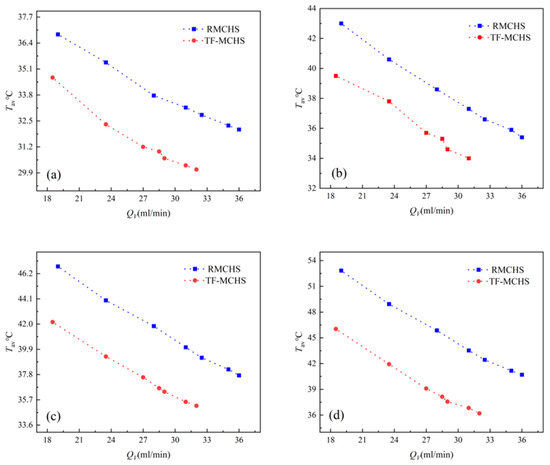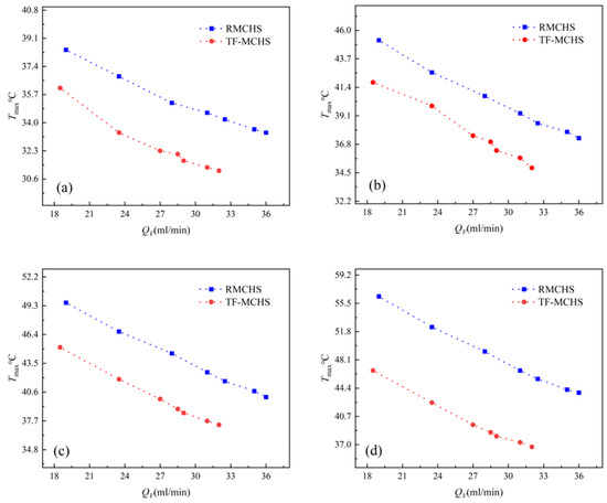 For chip cooling, the highest and average temperatures on the surface of the heat sink are of utmost concern, as the uniformity of temperature distribution directly affects the reliability, efficiency, and service life of microchips. Figure 9 and Figure 10 show the average temperature and maximum temperature of two heat sinks measured under four different power levels as a change in flow rate. Five thermocouple test points were set up on the bottom surface of the heat sink using a multichannel thermometer. The average and maximum temperatures of five data points were obtained. The test results indicate that the average and maximum temperatures of both types of radiators decrease with increasing flow rates. As the flow rate increases, the trend of decreasing average and maximum temperatures decreases, indicating that increasing the flow rate to lower the bottom temperature after reaching a certain value is not an effective method. From the figure, it can be seen that the heat dissipation capacity of TFMCHSs is significantly higher than that of RMCHSs, and as the power increases from 12 W to 33 W, the heat dissipation performance of TFMCHSs becomes better and better. When , compared with RMCHSs, the average and maximum temperatures of TFMCHSs decreased by 6.8 °C and 9.7 °C, respectively. This is of great significance for improving the reliability of chips and extending their lifespan.