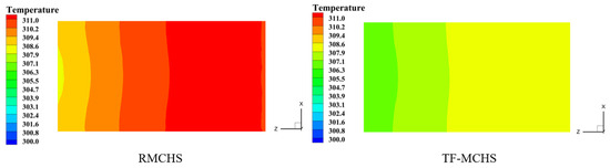 The temperature cloud maps of the bottom surfaces of the two radiators when and are shown in Figure 11. From the figure, due to the almost absence of fluid mixing in the straight passage, the temperature of the RMCHS is significantly higher than that of the TFMCHS. This is mainly because the flow inside the channel is laminar, and in the absence of external interference, there is basically only heat transfer inside the fluid, and thermal convection can be ignored. The closer the fluid is to the wall, the greater the influence of the boundary layer and the worse the heat transfer effect. Compared with the RMCHS, the TFMCHS has a much smaller temperature gradient and a more uniform temperature distribution. This indicates that ribs and grooves have a significant impact on the temperature field [36].