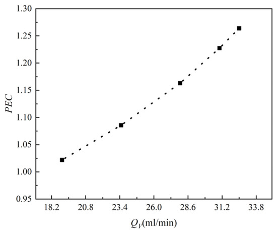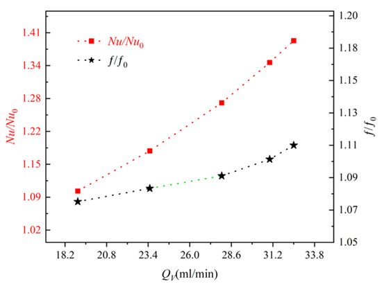 The relationship between the thermal enhancement factor and flow rate when is shown in Figure 13. From the graph, it can be seen that the enhancement coefficient is always greater than 1 and increases with the increase in inlet flow rate. This means that the comprehensive performance of the TFMCHS has been improved. When the flow rate is 32.5 mL/min, the thermal enhancement factor can reach 1.26. Therefore, for chip cooling, the TFMCHS is more economical and effective.